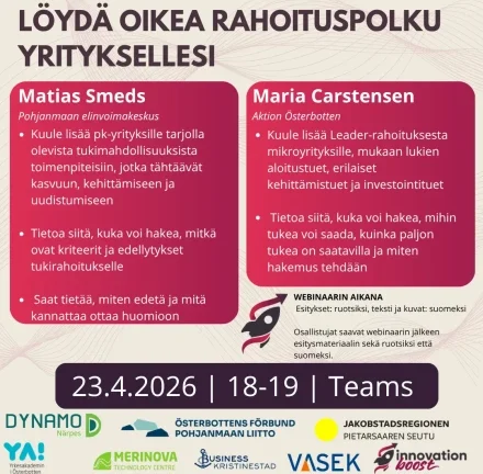 Hem / Evenemangkalender / Hitta vägen mot rätt finansiering för ditt företag Hitta vägen mot rätt finansiering för ditt företag 23.04.2026 18:00 – 23.04.2026 19:00 Hitta vägen mot rätt finansiering för ditt företag Matias Smeds, Österbottens Livskraftscentral * Hör mer om stödmöjligheter för SME-företag vid åtgärder som syftar till tillväxt, utveckling och förnyelse * Information om vem som kan söka, kriterier, förutsättningar för stödfinansiering * Du får veta hur man går tillväga och vad som är bra att tänka på Maria Carstensen, Aktion Österbotten *Hör mer om Leader-finansiering till mikroföretag, både startstöd, olika typer av utvecklingsstöd och investeringsstöd *Information om vem som kan söka, vad man kan få stöd för, hur mycket stödet är och hur man gör en ansökan UNDER WEBBINARIET Presentationer: svenska,text & bilder: finska Deltagarna får efter webbinariet presentationsmaterialet på både svenska och finska Läs mera på Österbottens evenemang webbsida