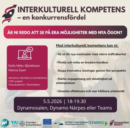 Hem / Evenemangkalender / Interkulturell kompetens – en konkurrensfördel Interkulturell kompetens – en konkurrensfördel 05.05.2026 18:00 – 05.05.2026 19:30 Tillväxt handlar inte alltid om nya resurser, utan om att använda det ni redan har på ett smartare sätt. Tillväxt handlar inte alltid om nya resurser, utan om att använda det ni redan har på ett smartare sätt. Genom att kombinera era styrkor med nya perspektiv kan ni utmana invanda arbetssätt, komma över hinder och upptäcka affärsmöjligheter ni kanske inte sett tidigare, t.ex. nya marknader, nya kunder och nya sätt att skapa värde. Interkulturell kompetens är kanske en av de mest underskattade framgångsfaktorerna idag! Företag som vågar ta tillvara mångfald och olika erfarenheter står starkare i en global och föränderlig marknad. Det handlar inte bara om inkludering – det handlar om konkurrensfördelar. Med interkulturell kompetens kan ni: · Nå ut till nya marknader med större träffsäkerhet · Förstå och möta en bredare kundbas · Skapa innovativa lösningar genom fler perspektiv · Stärka engagemang och delaktighet på arbetsplatsen · Utveckla effektivare och mer hållbara arbetssätt Kanske har ni redan delar av detta på plats – men inte fullt ut utnyttjat potentialen? Att investera i interkulturell kompetens är inte ett sidospår. Det är en strategisk fördel för företag som vill växa, utvecklas och vara relevanta – både idag och imorgon. Är ni redo att se på era möjligheter med nya ögon? Attractive Worklife in Ostrobothnia / ESF-projekt Yrkesakademin i Österbotten Sofia Mitts-Björkblom & Melina Saari Läs mera på Österbottens evenemang webbsida