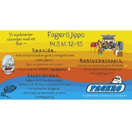 Hem / Evenemangkalender / Stjäribodens öppning och bakluckeloppis Stjäribodens öppning och bakluckeloppis 14.05.2026 12:00 – 14.05.2026 15:00 Stjäriboden öppnar för säsongen med bakluckeloppis! Stjäriboden självbetjäningskiosk öppnar för säsongen. Kl. 12-15 finns personal på plats som visar hur betalsystemet fungerar. Även lokala producenter som har försäljning i Stjäriboden är med. Kaffebjudning! Samtidigt ordnas bakluckeloppis där man kan fynda allt möjligt. På Restaurang Seaside får man spela minigolf gratis! Läs mera på Österbottens evenemang webbsida