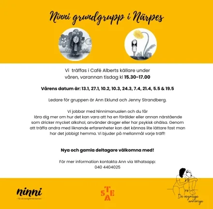 Etusivu / Tapahtumakalenteri / Ninni grundgrupp i Närpes Ninni grundgrupp i Närpes 24.03.2026 15:30 – 19.05.2026 17:00 Kamratstödgrupp för unga som har en närstående med beroende och/eller psykisk ohälsa Vi jobbar med Ninnimanualen och du får lära dig mer om hur det kan vara att ha en förälder eller annan närstående som dricker mycket alkohol, använder droger eller har psykisk ohälsa. Genom att träffa andra med liknande erfarenheter kan det kännas lite lättare fast man har det jobbigt hemma. Vi bjuder på mellanmål varje träff! Ledare för gruppen är Ann Eklund och Jenny Strandberg. Nya och gamla deltagare välkomna med! För mer information kontakta Ann via Whatsapp: 040 4404025 Läs mera på Österbottens evenemang webbsida