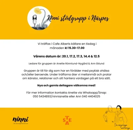 Etusivu / Tapahtumakalenteri / Ninni stödgrupp i Närpes Ninni stödgrupp i Närpes 17.03.2026 15:30 – 12.05.2026 17:00 Kamratstödgrupp för dig som har en förälder med beroende och/eller psykisk ohälsa Gruppen är till för dig som har en förälder med psykisk ohälsa och/eller beroende. Under träffarna äter vi mellanmål och pratar om känslor, relationer och att hantera vardagen på ett bra sätt. Nya och gamla deltagare välkomna med! Ledare för gruppen är Anette Rönnlund-Nygård & Ann Eklund För mer information kontakta Anette via Whatsapp/Snap: 050 5434893/ninnianette eller Ann 040 4404025 Läs mera på Österbottens evenemang webbsida