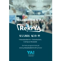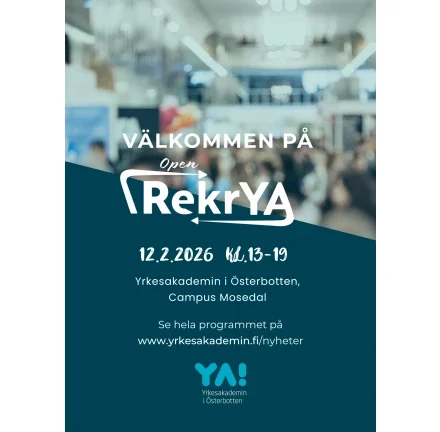 Etusivu / Tapahtumakalenteri / OpenRekrYA, Rekrymässa och Öppet Hus på Campus Mosedal, Närpes, 12.2.2026 kl 13-19 OpenRekrYA, Rekrymässa och Öppet Hus på Campus Mosedal, Närpes, 12.2.2026 kl 13-19 12.02.2026 13:00 – 12.02.2026 19:00 Ett 30-tal arbetsgivare, utbildningsarrangörer och övriga är på plats för att erbjuda jobb, sommarjobb eller studier. VÄLKOMNA PÅ OPENREKRYA TILL CAMPUS MOSEDAL, NÄRPES! DATUM: 12.2.2026 TID: kl 13:00-19:00 Företag och arbetsgivare berättar om jobbmöjligheter och utbildningsanordnare informerar om möjligheter till vidarestudier. Under mässan kan man även bekanta sig med utbildningar vid YA. Program i auditoriet: 13.00-13.30 Redo för arbetslivet?! -Nina Ingves, Hanken 14.00-14.30 Soffsamtal om studier och arbetsliv med tidigare YA studerande 18.00 Info om studier på YA och Närpes Gymnasium, kombistudier och internatet 18.30 Eftersnack och LIVE-musik med Casper Byggnings Under mässan kan du även ta del av CV-klinik och träna på arbetsintervjuer. Lunch serveras kl. 12-14 Pulled Pork, klyftpotatis, sallad, efterrätt 11 euro Salt och sött finns även att köpas under mässans gång. Aktiviteter vid utbildningarna: Närvårdare Delta i olika hälsogranskningar med närvårdarstuderande Merkonom Bekanta dig med årets UF-företag och köp deras produkter som finns till försäljning Merkonomstuderande säljer Kakkutukku-produkter till förmån för sin studieresa till Riga Bygg Kom och bekanta dig med byggutbildningen och verkstaden Testa din snabbhet i skruvdragning och tävla om fina priser. Utbildning som handleder för examensutbildning HUX Lär dig mer om utbildningen Lärare Anna svarar på dina frågor Logistik Utställning av fordon inne i och utanför logistikhallen Logistikstuderande bjuder på grillkorv Media Testa på att göra en Meme i Canva, bekanta dig med spel och lek med olika logon Metall Bekanta dig med utbildningsutrymmen, Cobot roboten och andra maskiner Lantbruk finns på plats i aulan Filmvisning av lantbruksbranschen Lärare och studerande finns på plats för att informera och svara på frågor Restaurang- och catering finns på plats i aulan Kom och bekanta dig med kock- och servitörsyrket Smaka på läckra tapas Evenemanget samt programmet i auditoriet är öppet för allmänheten under hela mässan. Läs mera på Österbottens evenemang webbsida
