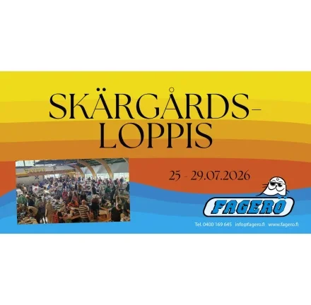 Etusivu / Tapahtumakalenteri / Skärgårdsloppis Skärgårdsloppis 25.07.2026 12:00 – 29.07.2026 20:00 Megaloppis på Fagerö! Årets megaloppis i paviljongen ordnas 25-29.07.2026! Öppet: Lördag 25.07 kl. 12-17 Söndag 26.07 kl. 12-17 Måndag 27.07 kl. 17-20 Tisdag 28.07 kl. 17-20 Onsdag 29.07 kl. 17-20 Det finns 120 loppisbord att fynda från! Kläder, skor, barnkläder, porslin, elektronik, möbler, cyklar, glas, prydnader, böcker, inredning – allt mellan himmel och jord ska hitta nya ägare! 😃 Det finns dricka till försäljning. Vi tar både kontanter och bankkort! 🤗 Adress: Björkgrundsvägen 1, 64550 Rangsby. På området finns simstrand, restaurang, lekpark och minigolf ⛳️ Läs mera på Österbottens evenemang webbsida