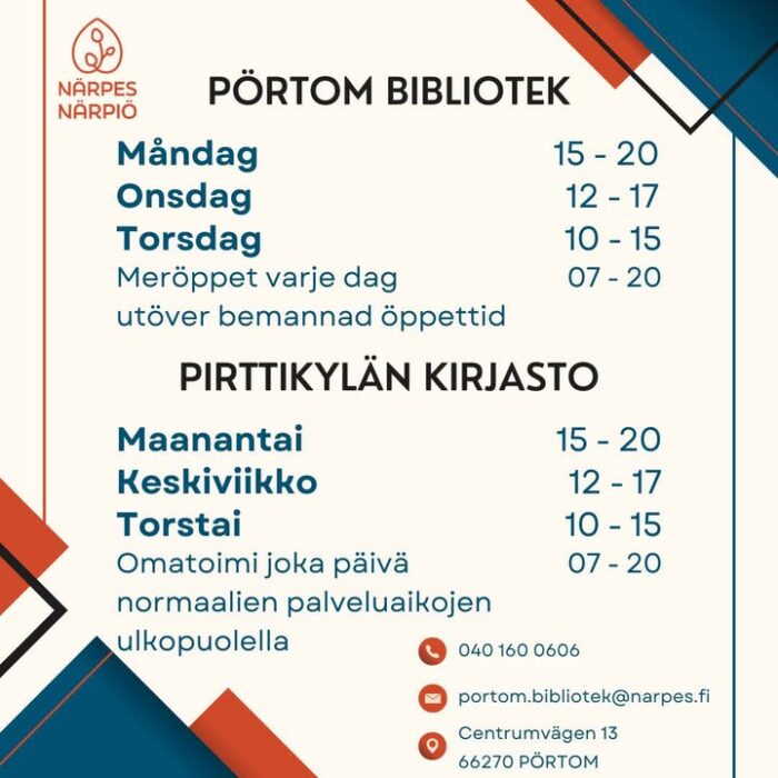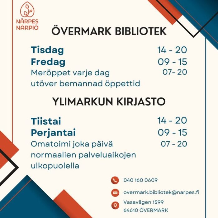 Kirjastojen yhteystiedot ja aukioloajat löytyvät Pohjanmaan kirjastoverkosto Fredrikasta.