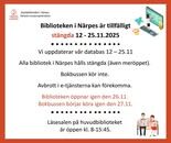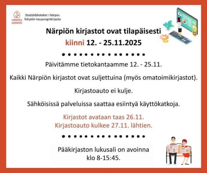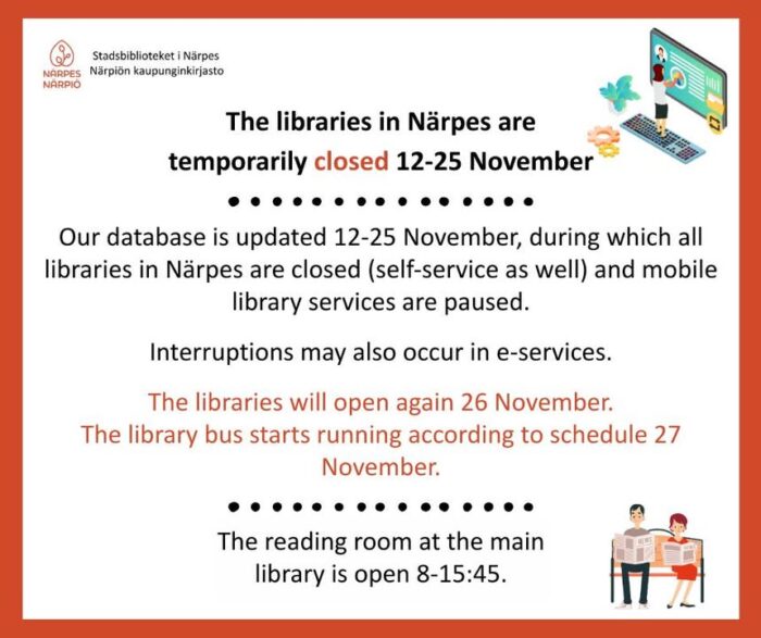 Närpiön kirjastot pyrkivät olemaan helposti lähestyttäviä, viihtyisiä ja inspiroivia kohtaamispaikkoja lukemiselle, oppimiselle ja kulttuurille kunnan koko alueella.