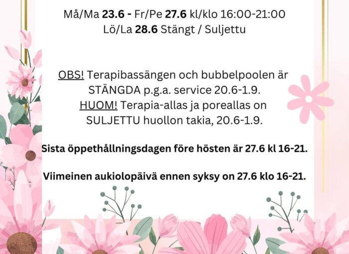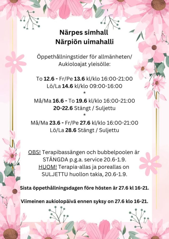 Hem / Kultur, fritid och unga / Motion och idrott / Simhallen Simhallen I simhallens tre olika bassänger kan alla, oberoende ålder, hitta en lämplig plats att röra på sig.Utöver motionssimning kan man träna vattenlöpning och delta i ledd vattengymnastik eller virtuell vattengymnastik på egen hand när det passar dig. Simhallens öppethållningstider för allmänheten:Må – fre kl 16:00 – 21:00Lö kl 9:00 – 16:00Bassängavdelningen samt cafeterian stänger en halv timme före stängningsdags ochbiljettkassan stänger 1 timme före stängning. Morgonsimning tisdagar och torsdagar:Kassan öppen 07:15-07:30.Bassängerna öppna 07:30-08:30. Aktuellt: 5.12 simhallen öppen 11-186.12 stängt ✨ Ljussimning i simhallen! ✨ Måndag 15.12 kl. 18–21Simhallen är öppen som vanligt kl. 16–18, och ljussimningen börjar kl. 18. Tisdag morgon 16.12 kl. 7.30–8.30Ljussimning under morgonsimmet – en lugn start på dagen.Kassan är öppen kl. 7.15–8.00. Betalning med kort eller kontant. Välkommen till en stämningsfull och avkopplande simupplevelse i skenet av levande ljus! Åldersgräns: 18 årMorgonsimning fr.o.m. 30.9.2025Morgonsim ordnas tisdagar och torsdagar. Kassan är öppen kl 07:15-07:30. Efter detta stängs kassan. Bassängområdet är öppet kl 07:30-08:30. Betalning sker med simhallskort eller betalkort. Ingen påfyllning av simhallskort eller köp från cafeterian är möjliga under den tid kassan är öppen för morgonsim. Alla som deltar i morgonsimningen måste vara klara och ha lämnat omklädningsrummen kl 8.45. Varmt välkomna!