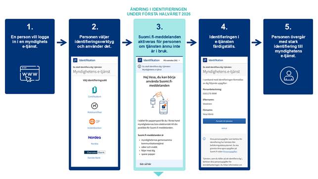 Hem / Staden och förvaltningen / Informationshantering / Suomi.fi – meddelanden Suomi.fi – meddelanden Du får en elektronisk postlåda när du identifierar dig i myndigheternas e-tjänster 2026 Mottagandet av myndighetspost blir i första hand digitalt under första halvåret 2026. Ändringen sker, när lagstiftningen om digital prioritering av officiell post träder i kraft. När du identifierar dig för första gången efter att ändringen har trätt i kraft i [den egna organisationens eller e-tjänstens namn] eller någon annan myndighets e-tjänst skapas en digital postlåda för dig i Suomi.fi-meddelanden. I fortsättningen kommer posten från flera myndigheter hit. Suomi.fi-meddelanden ersätter myndigheternas papperspost: samma brev kommer inte hem till dig senare. Syftet med ändringen är att uppmuntra människor att i första hand ta emot myndighetsposten digitalt. Att ta i bruk Suomi.fi-meddelanden sparar tid för både medborgarna och myndigheterna då meddelanden går snabbt och säkert till rätt mottagare och rätt plats. För närvarande använder över 2 miljoner personer Suomi.fi-meddelanden. Vi rekommenderar att du aktiverar tjänsten redan nu när du identifierar dig i någon myndighets e-tjänst. När den nya lagstiftningen har trätt i kraft under första halvåret 2026 efterfrågas inte längre ett separat samtycke till ibruktagandet, utan i samband med identifieringen informeras man om att Suomi.fi-meddelanden tas i bruk. Efter denna ändring används Suomi.fi-meddelanden av över fyra miljoner personer. Hur och för vem tas Suomi.fi-meddelanden i bruk? Suomi.fi-meddelanden tas i bruk för dig om du är myndig och ännu inte använder Suomi.fi-meddelanden. Du ser en notifikation om att Suomi.fi-meddelanden tas i bruk när du identifierar dig starkt i den offentliga förvaltningens e-tjänst. Ange din e-postadress i samband med ibruktagandet och bekräfta den inom en timme. Då får du alltid en notifikation till din e-post när du har fått ny post till Suomi.fi-meddelanden. Efter att du angett din e-postadress fortsätter du identifieringen som vanligt och går till den e-tjänst dit du var på väg. Observera när du uträttar ärenden för en organisation eller för någon annan att Suomi.fi-meddelandena tas i bruk för dig – inte för den person eller organisation på vars vägnar du ska uträtta ärenden. Om du inte använder den offentliga förvaltningens e-tjänster med stark autentisering får du även i fortsättningen myndighetspost som papperspost. Ändringen gäller inte heller minderåriga eller personer som står under intressebevakning eller som har en gällande intressebevakningsfullmakt. Illustration av hur Suomi.fi-meddelanden tas i bruk som en del av stark autentisering i den offentliga förvaltningens e-tjänster under första halvåret 2026, när lagstiftningen om digital prioritering av officiell post har trätt i kraft: Hur kan jag läsa meddelanden som kommit till Suomi.fi-meddelanden? Du kan läsa myndighetsmeddelanden som kommit till Suomi.fi-meddelanden i Suomi.fi-mobilapplikationen eller logga in i Suomi.fi-webbtjänsten och gå till ”Meddelanden”. Identifikationen sker med bankkoder, mobilcertifikat eller med det elektroniska certifikatet på identitetskortet. Du får alltid en notifikation till din e-post när du får ett nytt meddelande till Suomi.fi-meddelanden. Du får också notifikationer om inkomna meddelanden i Suomi.fi-mobilapplikationen om du har laddat ner appen. Du kan också ta i bruk Suomi.fi-meddelanden på https://www.suomi.fi/meddelanden eller genom att ladda ner Suomi.fi-mobilappen. Men vad om jag även i fortsättningen vill ha min myndighetspost som papperspost? Övergången till digital myndighetspost innebär inte att ingen i fortsättningen kan ta emot myndigheternas post som pappersbrev. Suomi.fi-meddelanden tas inte i bruk om du inte använder myndigheternas e-tjänster. Då får du även i fortsättningen myndighetsposten i pappersform. Ändringen gäller inte minderåriga eller personer som står under intressebevakning. All myndighetspost inkommer inte heller digitalt till Suomi.fi-meddelanden, eftersom vissa myndigheter också kan använda andra digitala kanaler för elektronisk kommunikation. Varje organisation informerar om detta i sina tjänster. Om du inte vill få myndighetspost till Suomi.fi-meddelanden kan du återgå från Suomi.fi-meddelanden till en mottagare av papperspost genom att ändra tjänstens inställningar eller kontakta kundservicen hos Myndigheten för digitalisering och befolkningsdata. Du kan göra ändringen först efter att Suomi.fi-meddelanden tagits i bruk 2026, inte före det. Valet att ta emot papperspost gäller ett halvt år åt gången. Om du efter sex månader identifierar dig på nytt i myndigheternas e-tjänster, tas Suomi.fi-meddelanden i bruk på nytt. Om du använder Suomi.fi-mobilapplikationen, observera att enbart radering av applikationen inte tar bort Suomi.fi-meddelanden. tjänsten alltid ska raderas i inställningarna för Suomi.fi-meddelanden. Om du vill kan du också själv när som helst ta i bruk Suomi.fi-meddelanden på nytt genom att ladda ner Suomi.fi-applikationen eller ta i bruk tjänsten på suomi.fi/meddelanden. Ytterligare information Mer information om Suomi.fi-meddelanden: https://www.suomi.fi/meddelanden Mer information om Suomi.fi-identifikation: https://www.suomi.fi/anvisningar-och-stod/identifikation/vad-ar-suomifi-identifikation Organisationer som skickar post till Suomi.fi-meddelanden: https://www.suomi.fi/anvisningar-och-stod/meddelanden/organisationer-och-tjanster-som-anvander-suomifi-meddelanden Så här slutar du använda Suomi.fi-meddelanden: https://www.suomi.fi/anvisningar-och-stod/meddelanden/anvandning-av-meddelanden/sluta-anvanda-meddelanden Vad är Suomi.fi-meddelanden? Suomi.fi-meddelanden är en informationssäker digital postlåda som ersätter myndighetspost som skickas i pappersform. Åtskilliga myndigheter använde